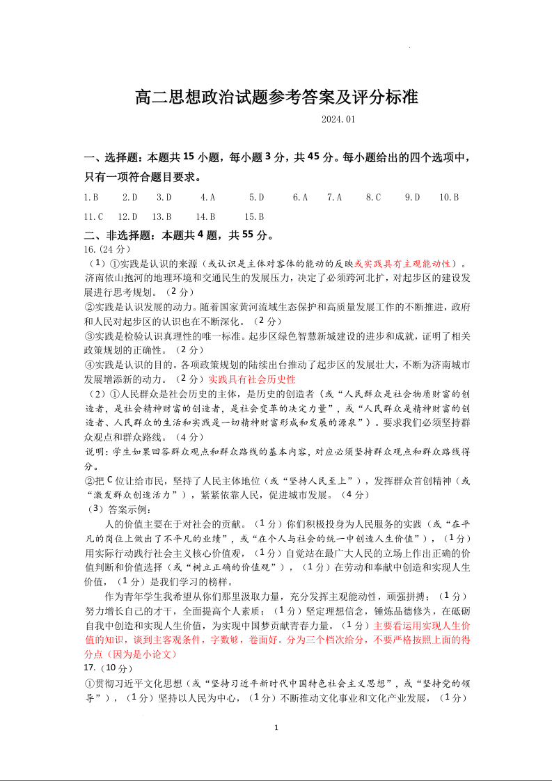 山东省济南市2023-2024学年高二上学期期末考试政治答案