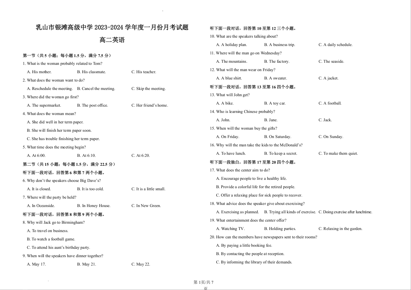 山东省威海市乳山市银滩高级中学2023-2024学年高二上学期1月考试英语(原卷版)