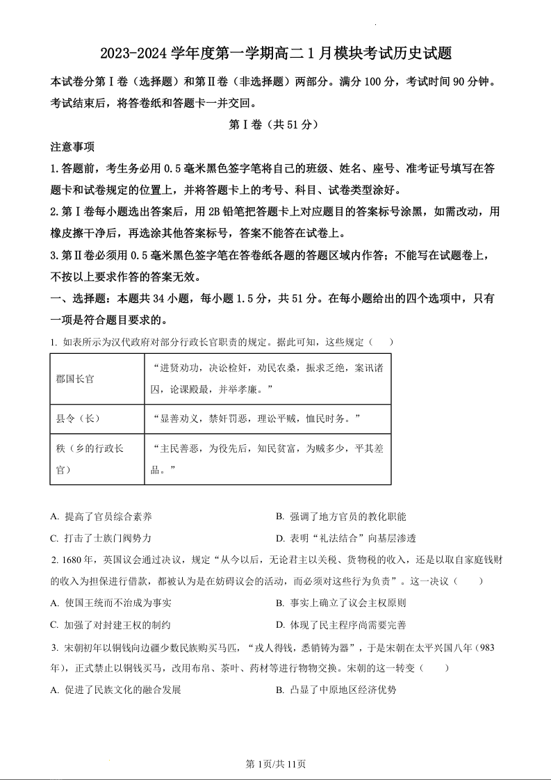 山东省威海市乳山市银滩高级中学2023-2024学年高二上学期1月考试历史(原卷版)