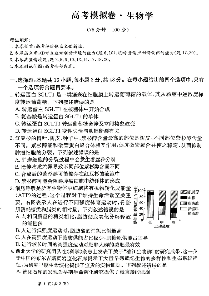甘肃省区域2024-2025学年下学期高三高考模拟考试生物