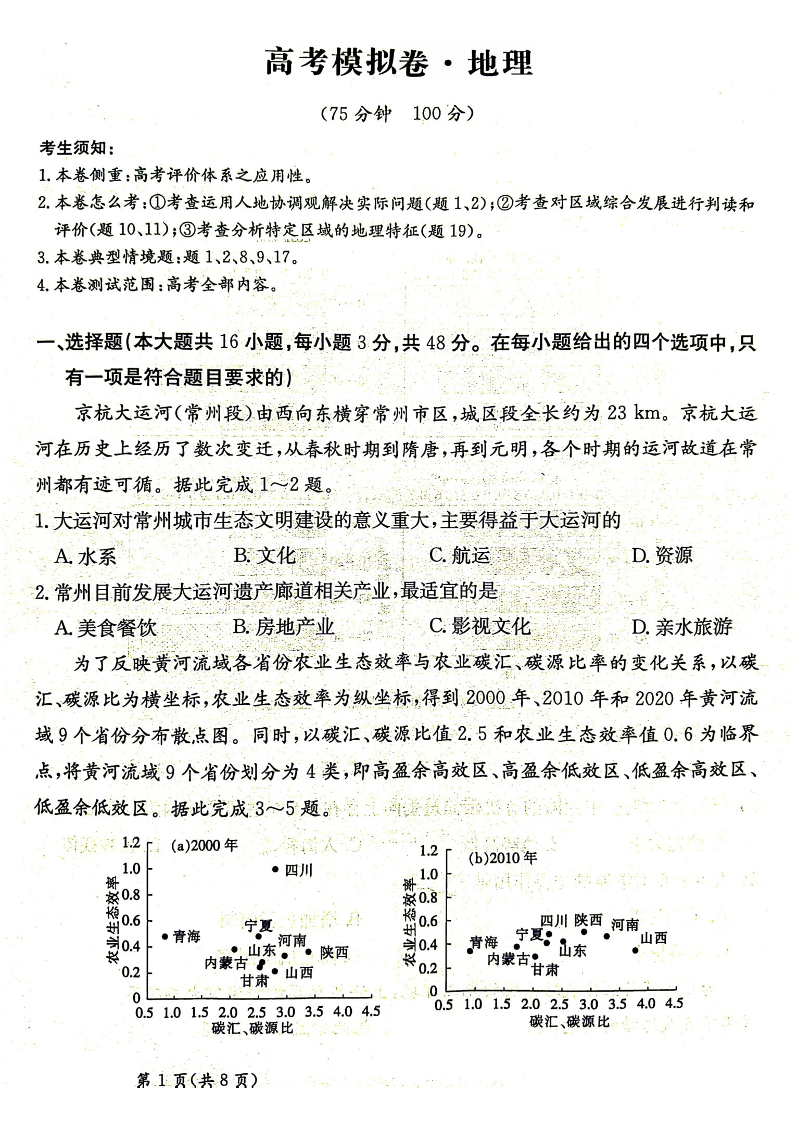甘肃省区域2024-2025学年下学期高三高考模拟考试地理