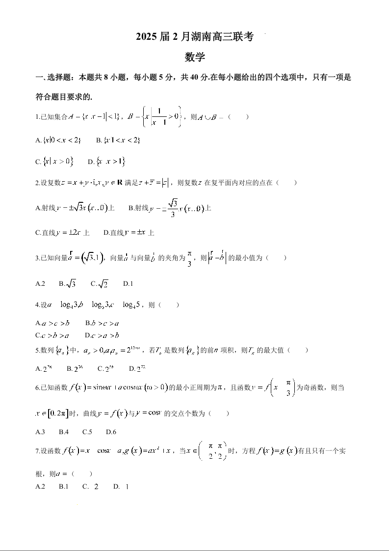 湖南省部分高中2024-2025学年下学期2月高三开学联考数学+答案