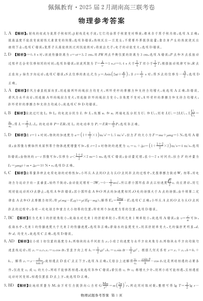 湖南省部分高中2024-2025学年下学期2月高三开学联考物理答案
