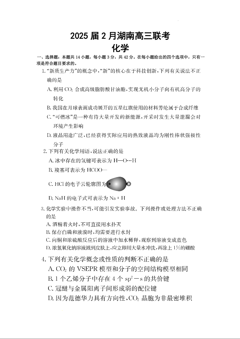 湖南省部分高中2024-2025学年下学期2月高三开学联考化学