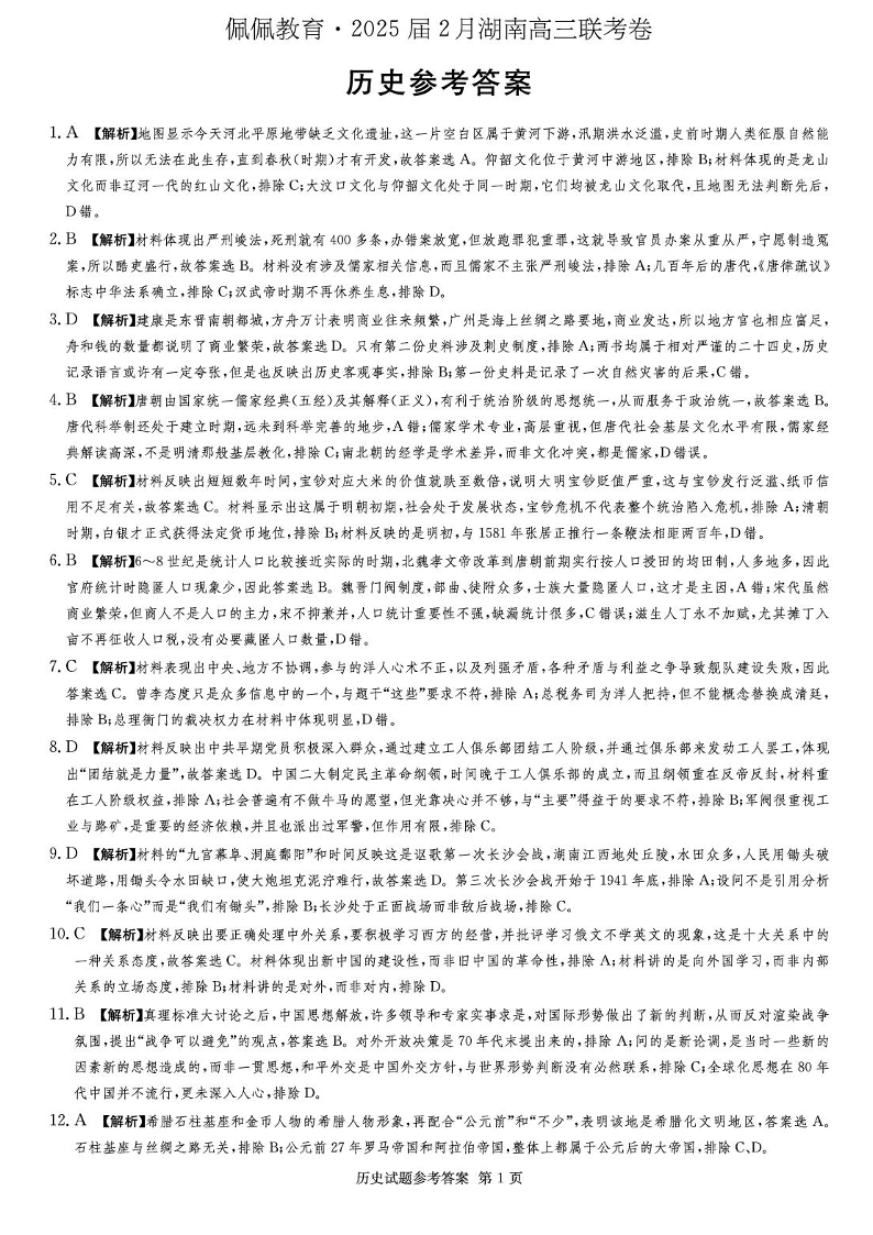 湖南省部分高中2024-2025学年下学期2月高三开学联考历史答案