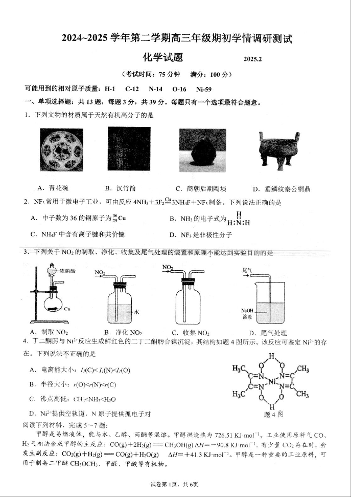 江苏省扬州市高邮市2024-2025学年下学期高三开学考试化学+答案