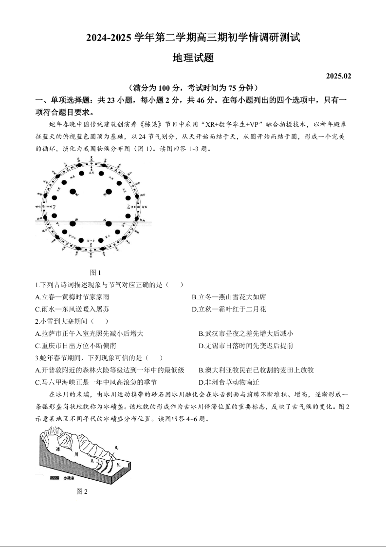 江苏省扬州市高邮市2024-2025学年下学期高三开学考试地理+答案