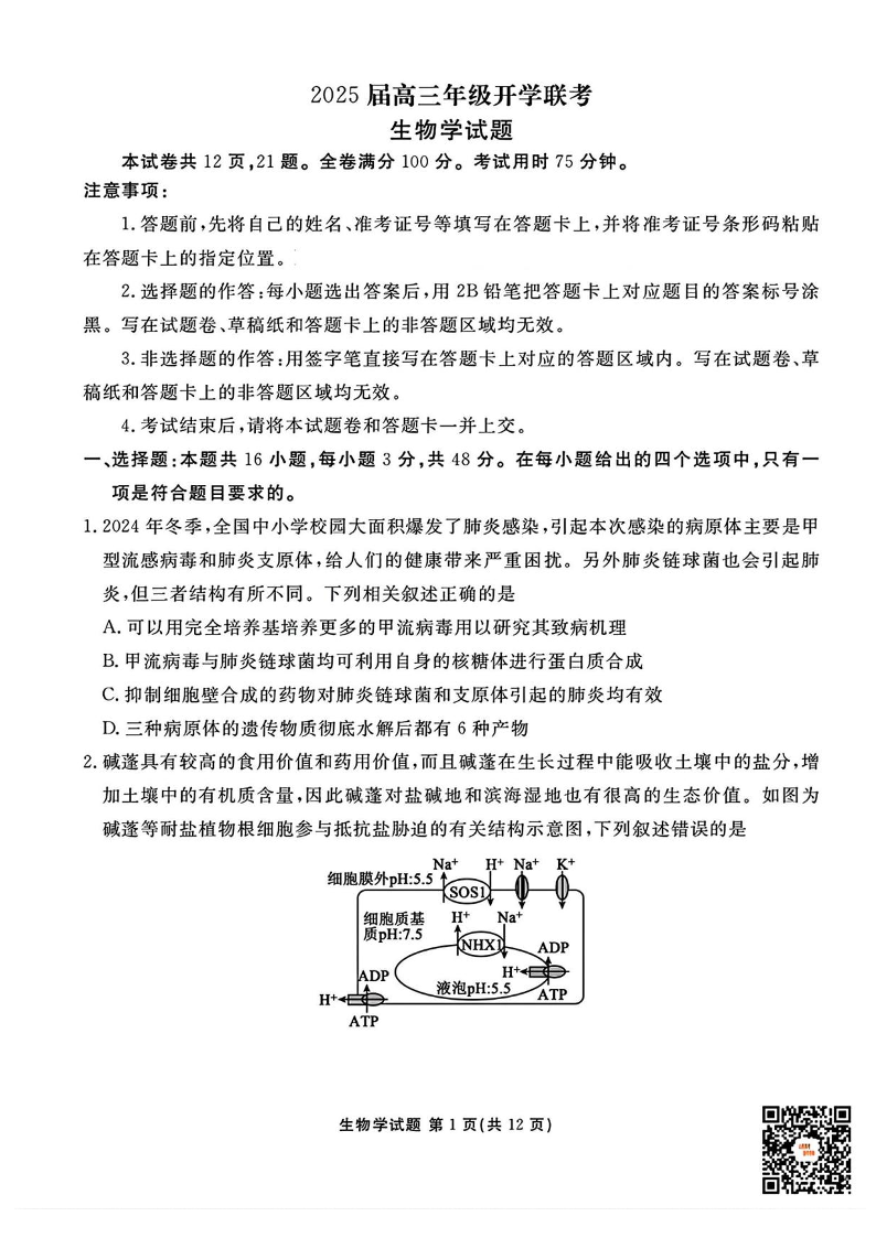 山西省区域高中2024-2025学年下学期2月高三开学联考生物+答案