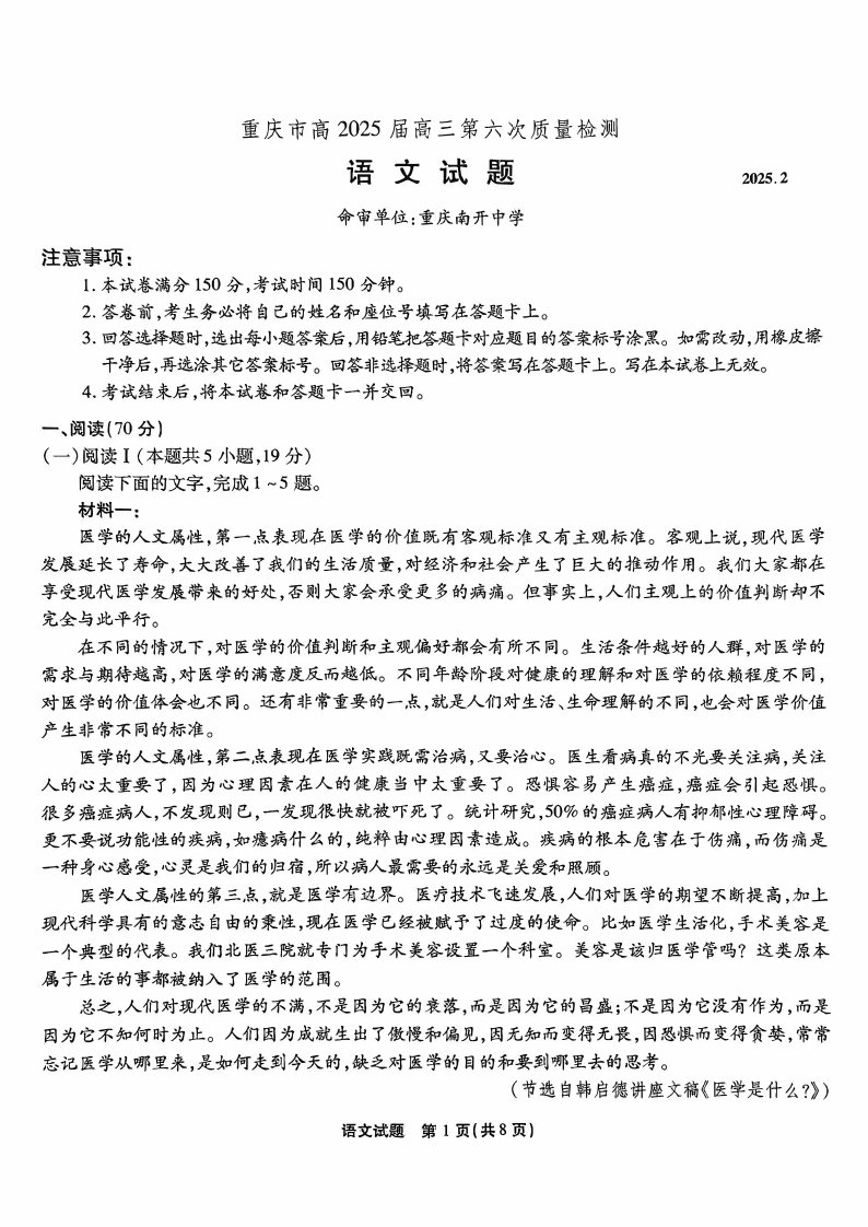 重庆市南开中学2024-2025学年高三第六次质量检测语文