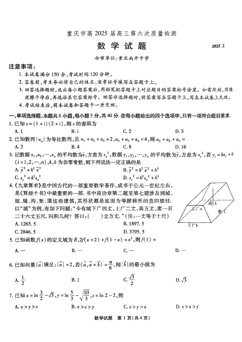 重庆市南开中学2024-2025学年高三第六次质量检测数学