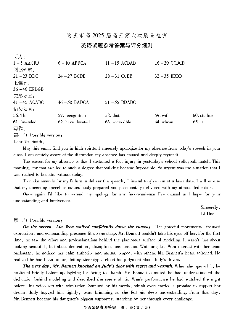 重庆市南开中学2024-2025学年高三第六次质量检测英语答案