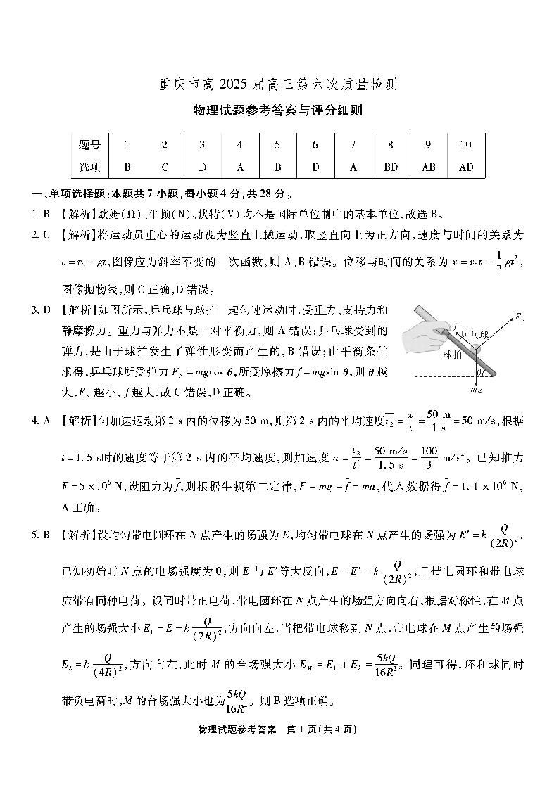 重庆市南开中学2024-2025学年高三第六次质量检测物理答案
