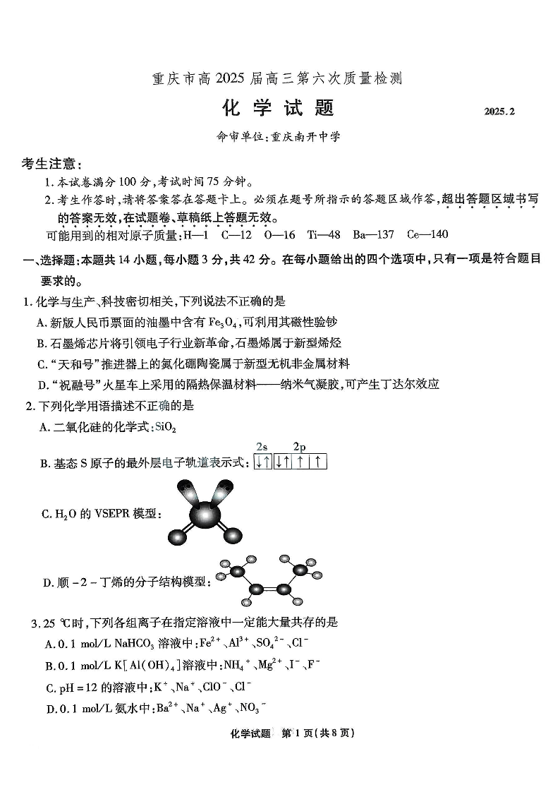 重庆市南开中学2024-2025学年高三第六次质量检测化学