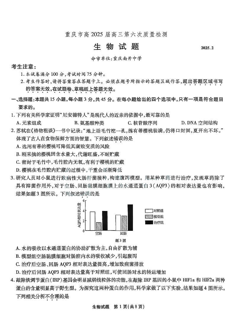 重庆市南开中学2024-2025学年高三第六次质量检测生物