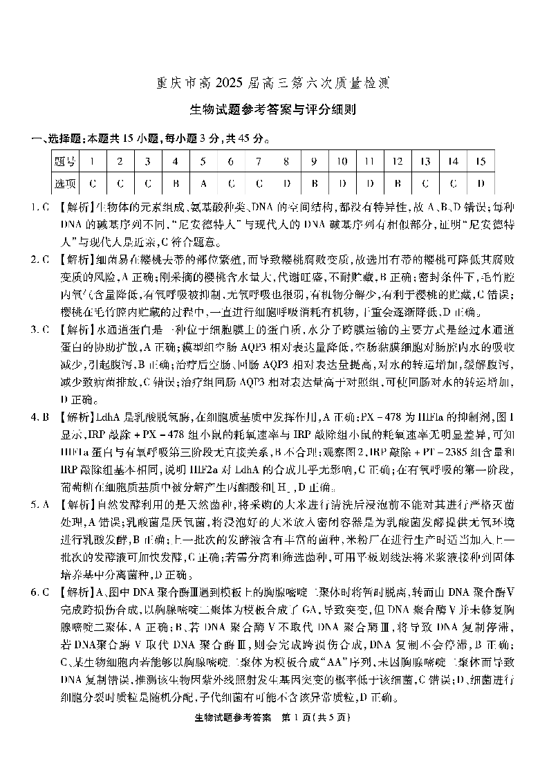 重庆市南开中学2024-2025学年高三第六次质量检测生物答案