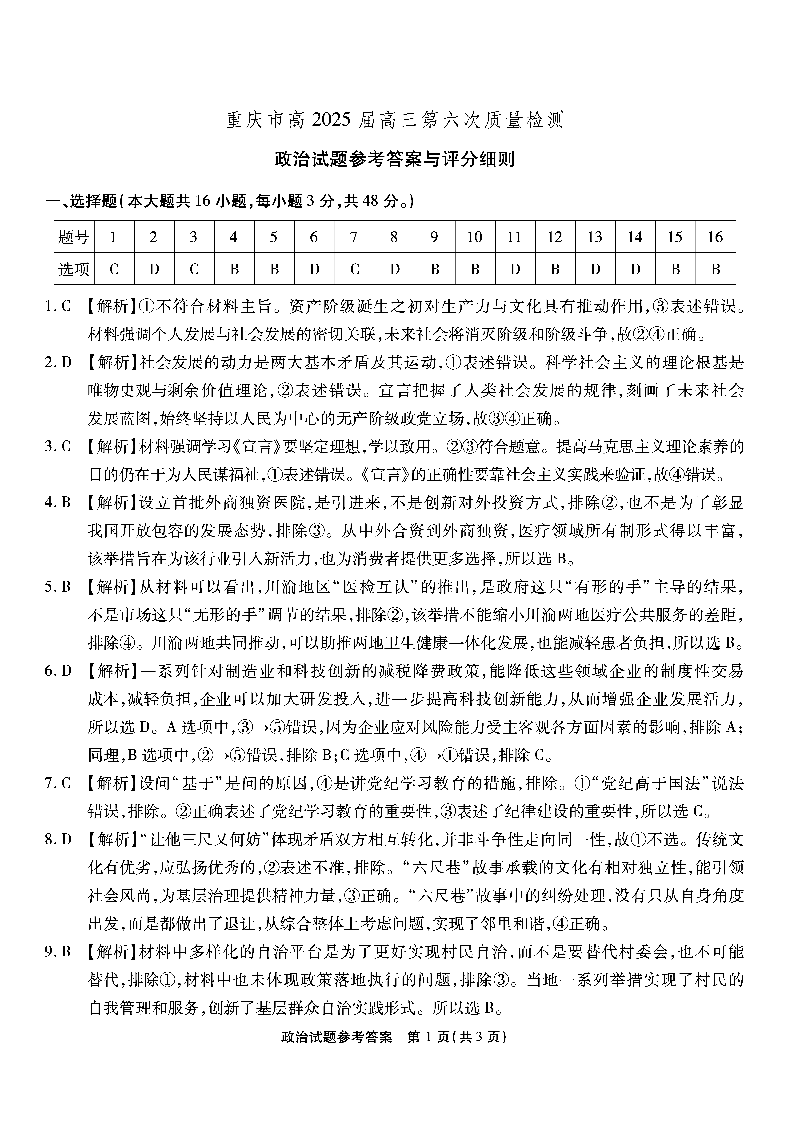 重庆市南开中学2024-2025学年高三第六次质量检测政治答案