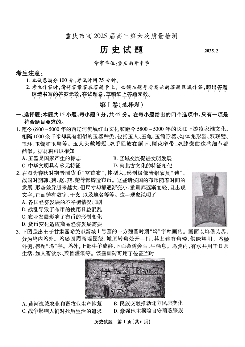 重庆市南开中学2024-2025学年高三第六次质量检测历史