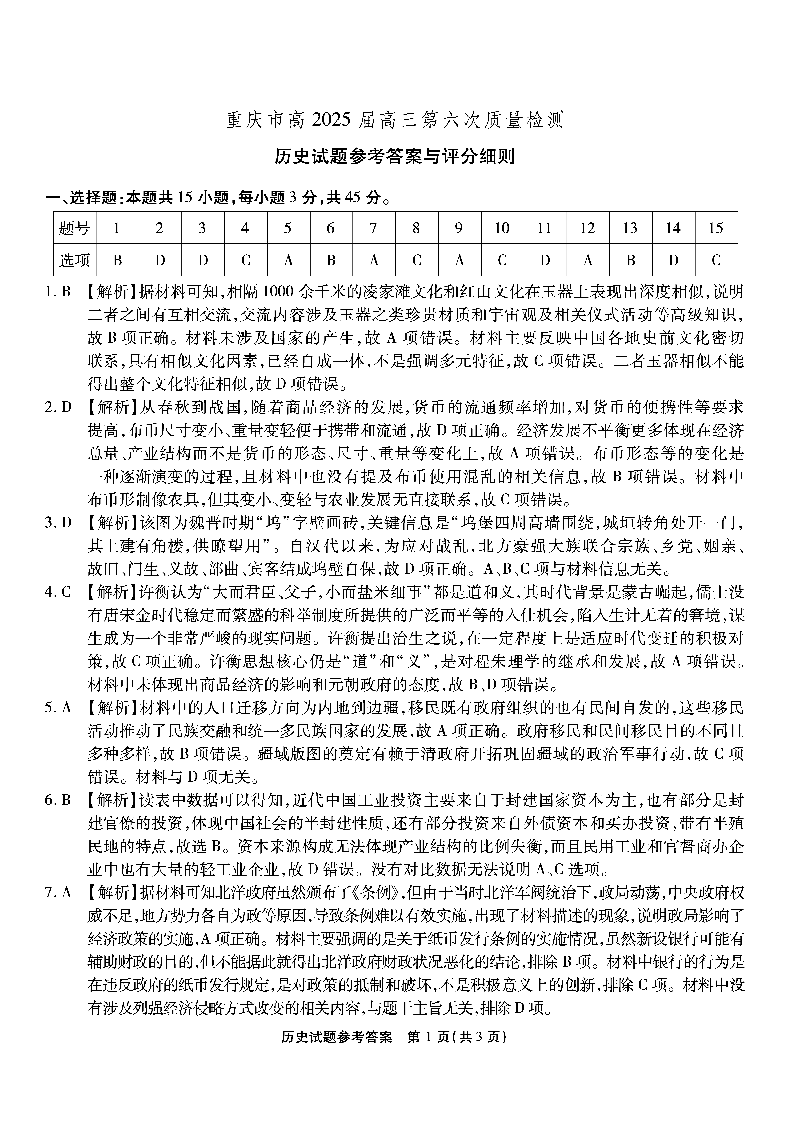 重庆市南开中学2024-2025学年高三第六次质量检测历史答案
