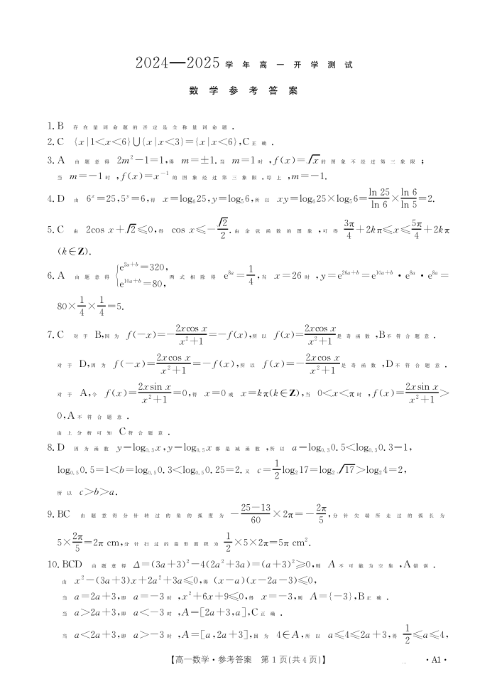 河南省区域高中2024-2025学年下学期高一开学考试数学答案