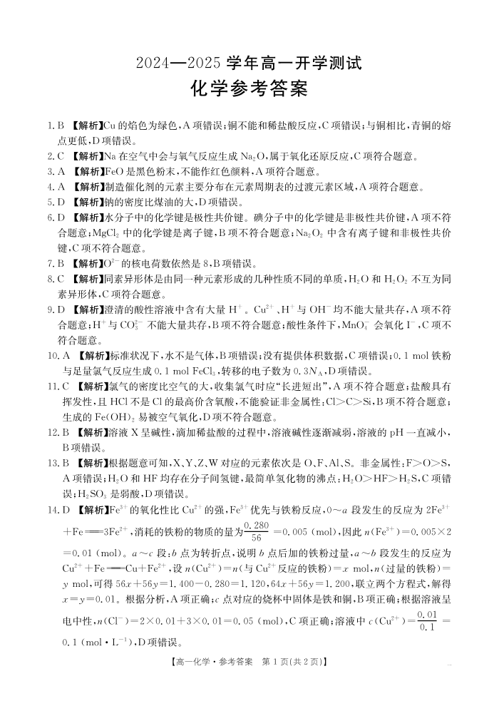 河南省区域高中2024-2025学年下学期高一开学考试化学答案