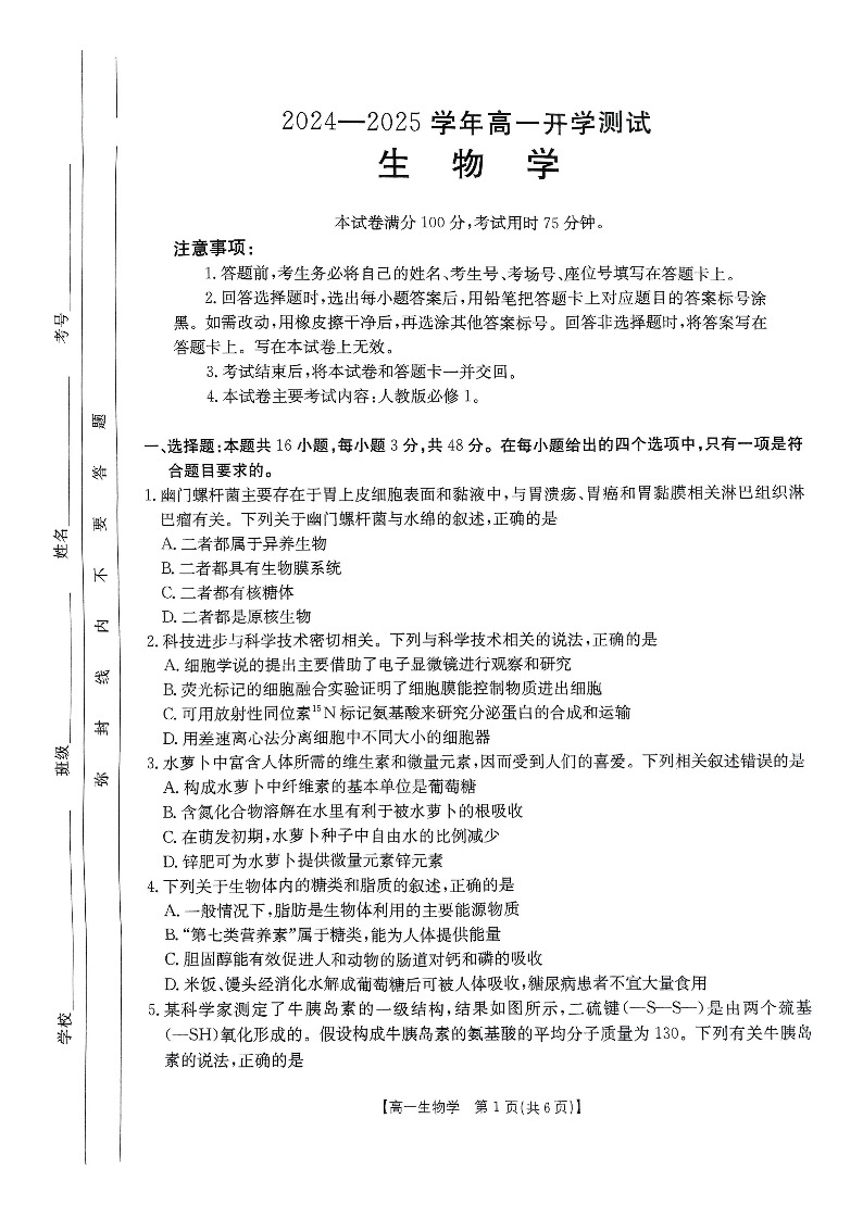河南省区域高中2024-2025学年下学期高一开学考试生物学