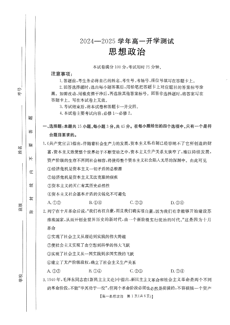 河南省区域高中2024-2025学年下学期高一开学考试政治