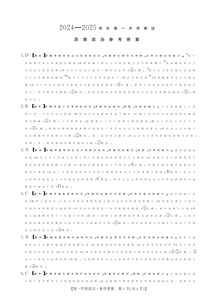 河南省区域高中2024-2025学年下学期高一开学考试政治答案