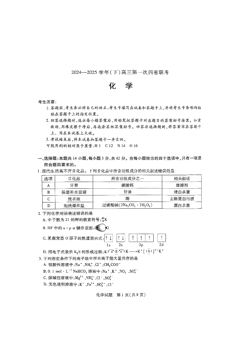 陕晋青宁四省部分高中2024-2025学年下学期2月高联考化学