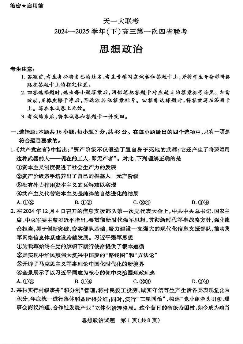 陕晋青宁四省部分高中2024-2025学年下学期2月高联考政治