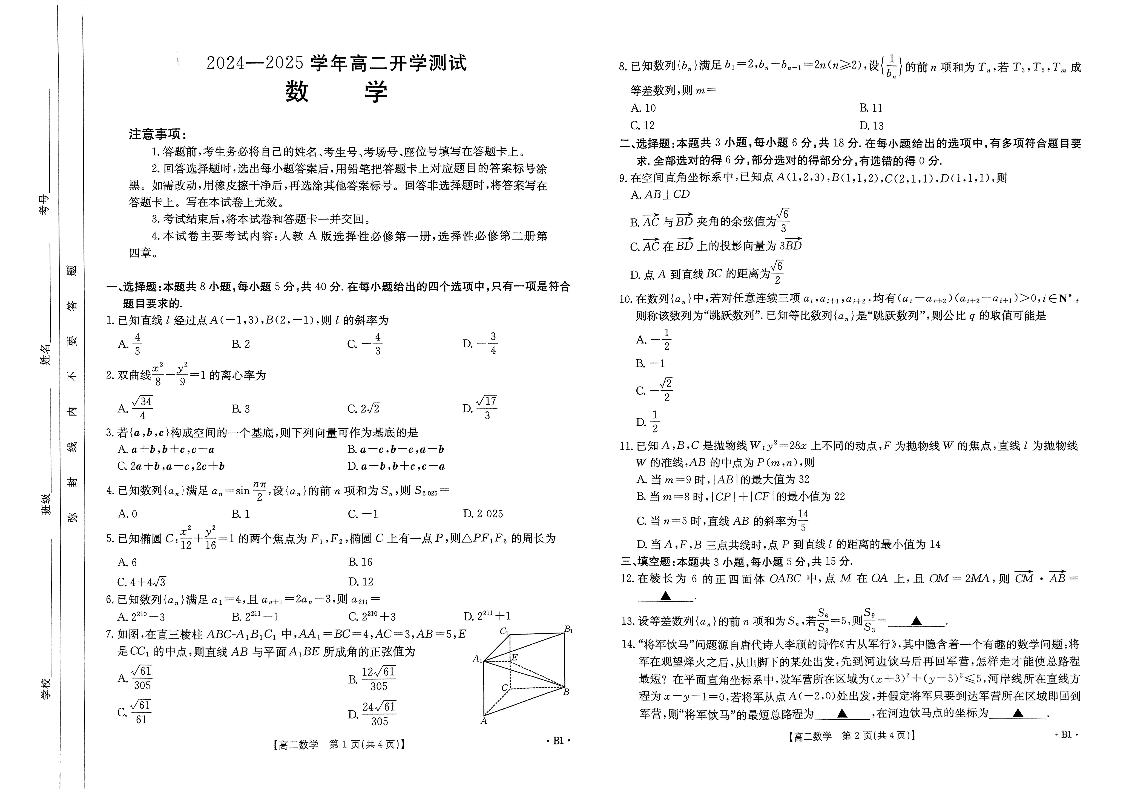 河南省区域高中2024-2025学年下学期2月高二开学考试数学