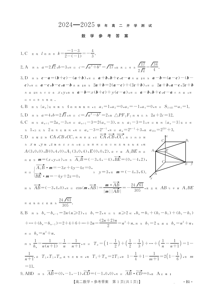 河南省区域高中2024-2025学年下学期2月高二开学考试数学答案