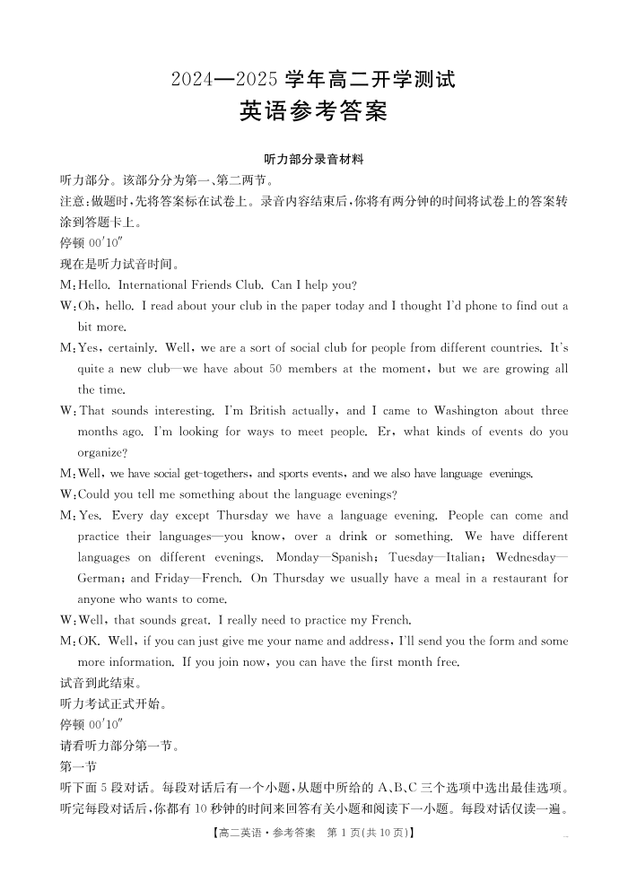 河南省区域高中2024-2025学年下学期2月高二开学考试英语答案