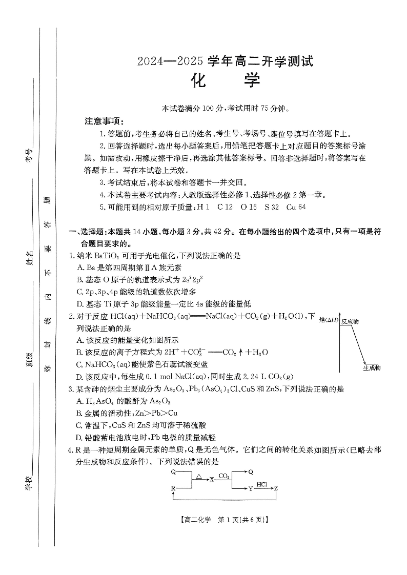 河南省区域高中2024-2025学年下学期2月高二开学考试化学