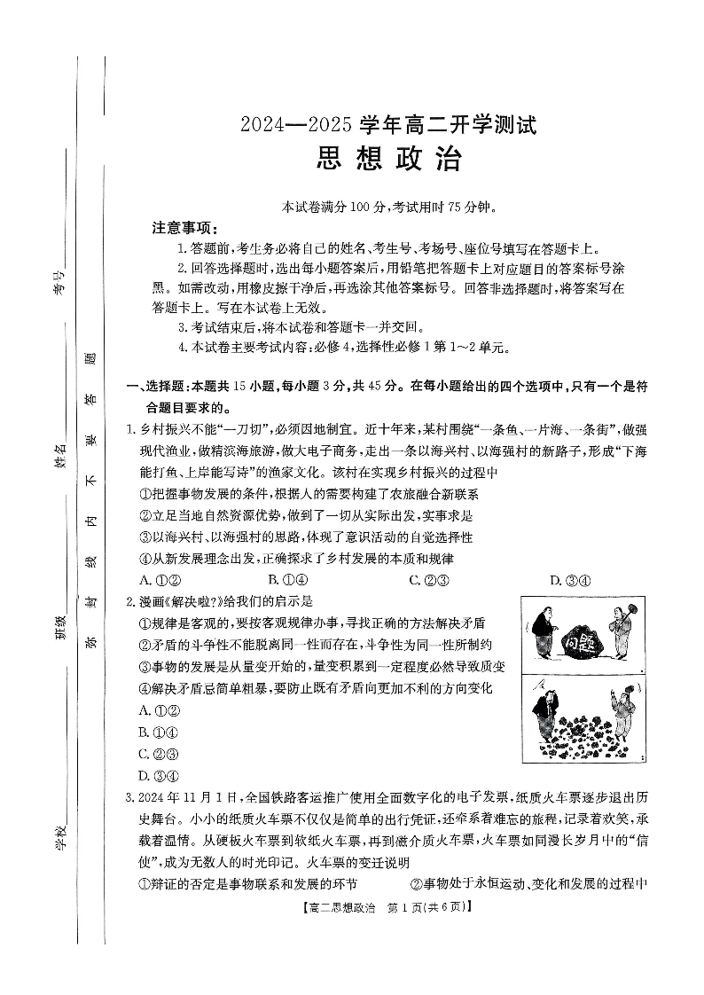 河南省区域高中2024-2025学年下学期2月高二开学考试政治