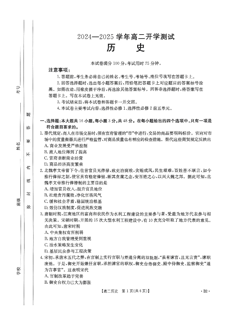 河南省区域高中2024-2025学年下学期2月高二开学考试历史