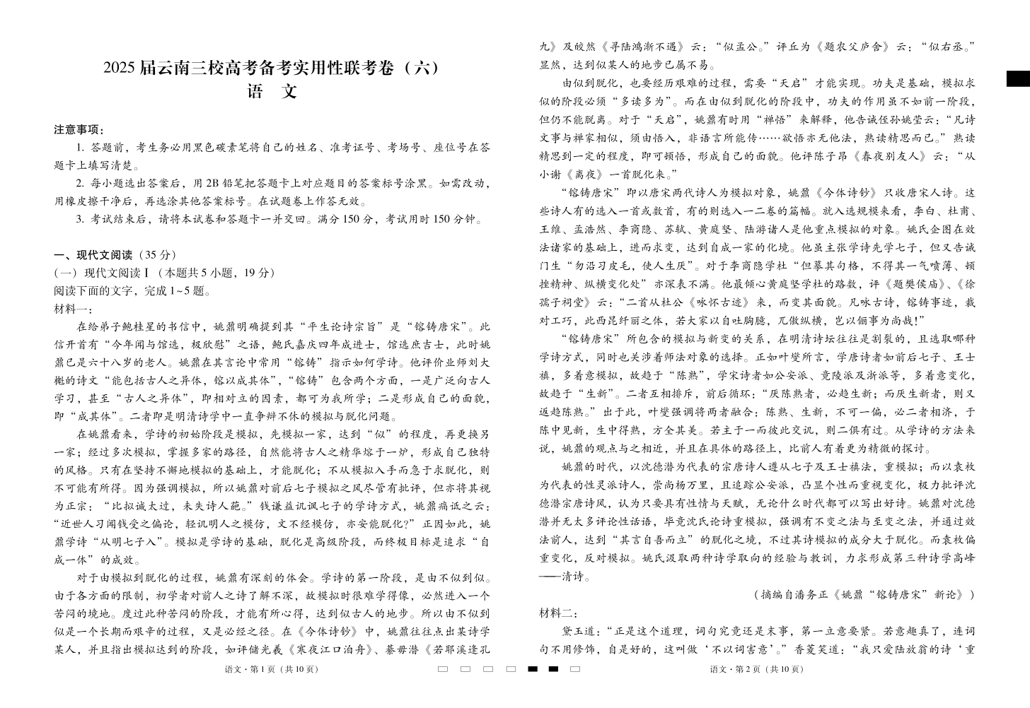 云南省三校2024-2025学年下学期2月高三备考实用性联考卷(六)语文