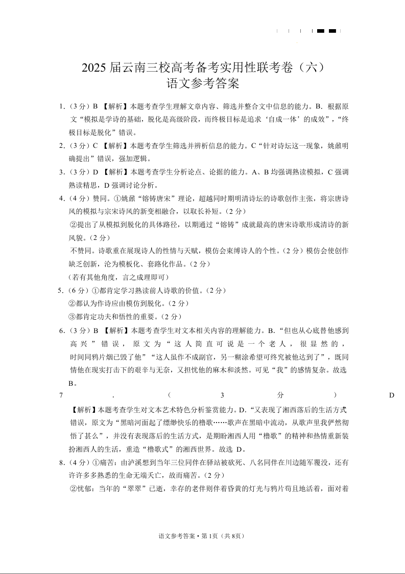 云南省三校2024-2025学年下学期2月高三备考实用性联考卷(六)语文答案