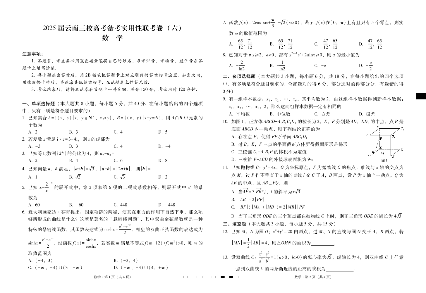 云南省三校2024-2025学年下学期2月高三备考实用性联考卷(六)数学