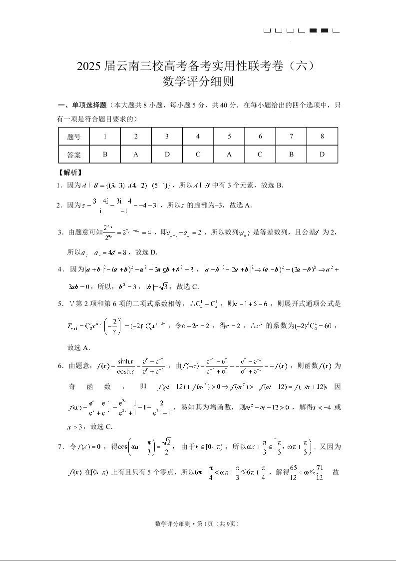 云南省三校2024-2025学年下学期2月高三备考实用性联考卷(六)数学答案
