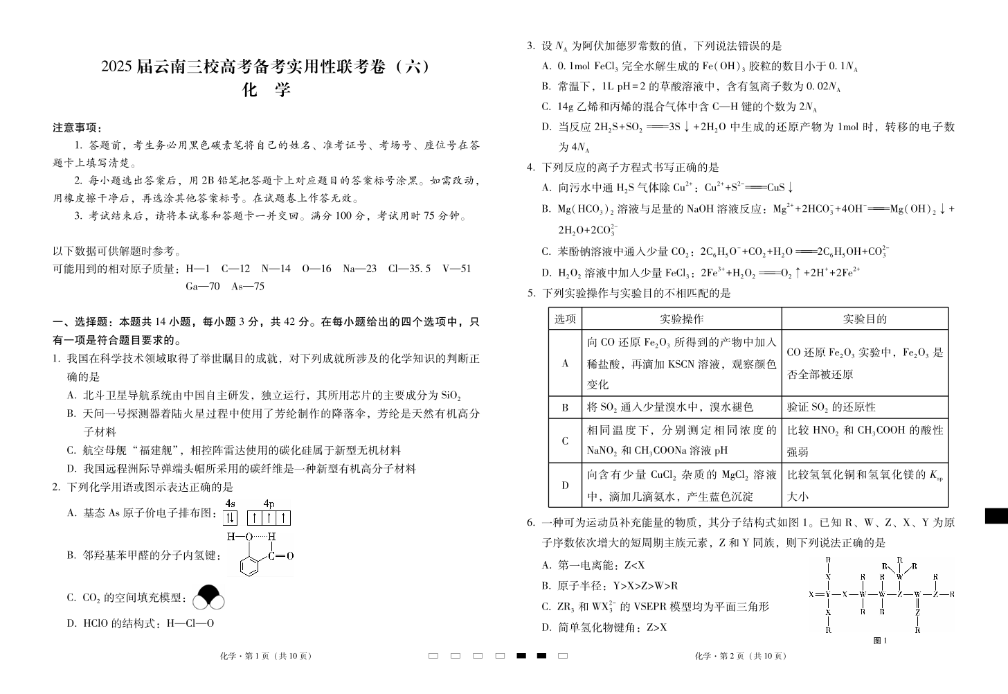 云南省三校2024-2025学年下学期2月高三备考实用性联考卷(六)化学
