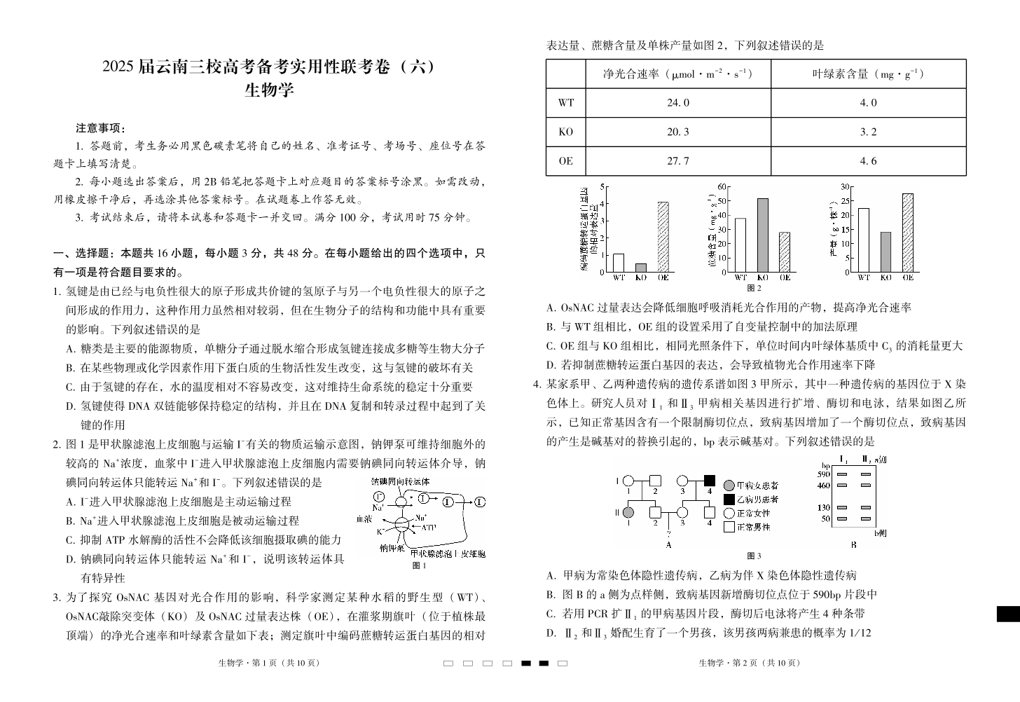 云南省三校2024-2025学年下学期2月高三备考实用性联考卷(六)生物