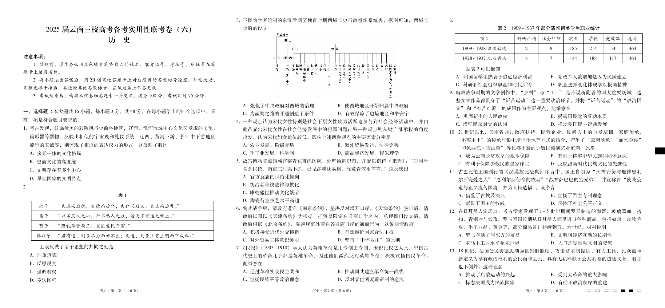 云南省三校2024-2025学年下学期2月高三备考实用性联考卷(六)历史