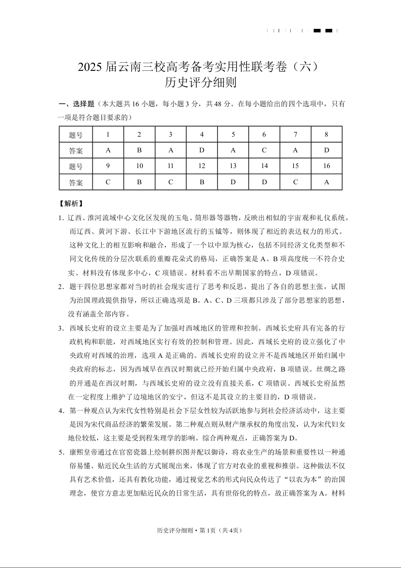 云南省三校2024-2025学年下学期2月高三备考实用性联考卷(六)历史答案