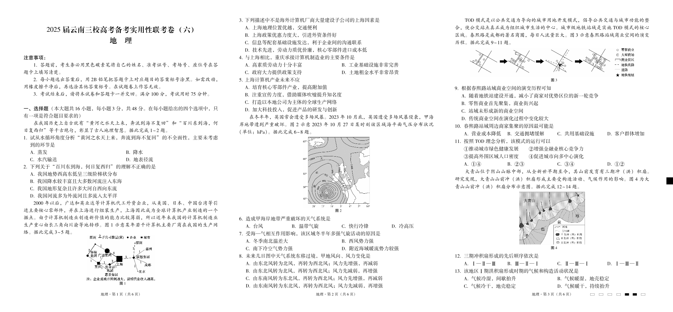云南省三校2024-2025学年下学期2月高三备考实用性联考卷(六)地理