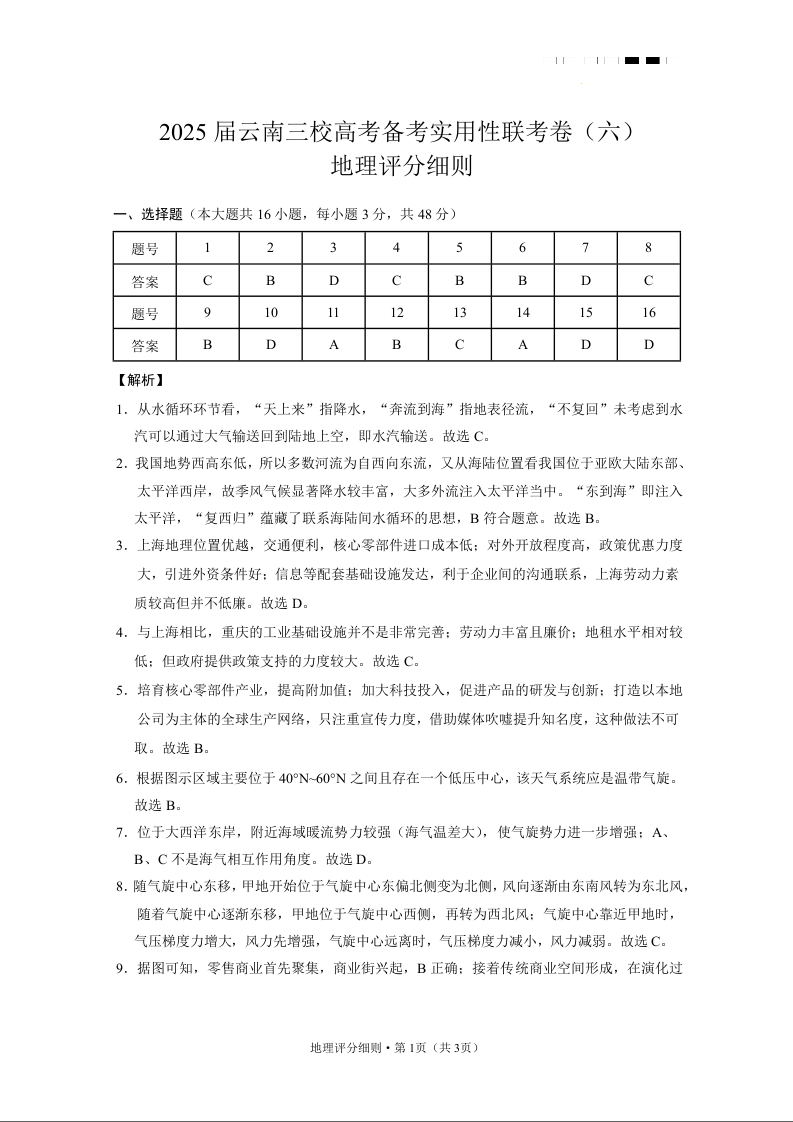 云南省三校2024-2025学年下学期2月高三备考实用性联考卷(六)地理答案