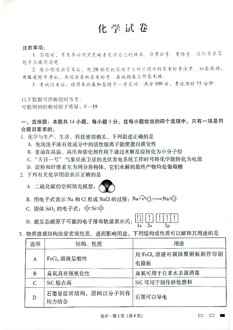 云南省师大学附中2024-2025学年下学期高三开学考试化学