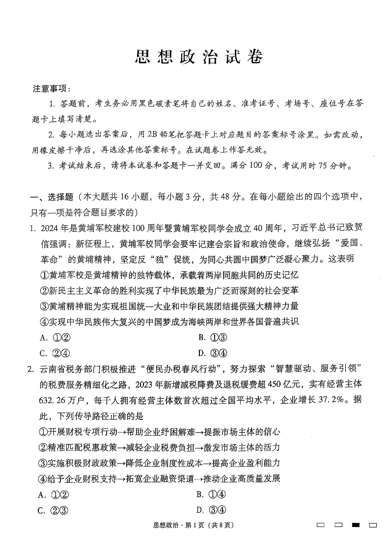 云南省师大学附中2024-2025学年下学期高三开学考试题政治