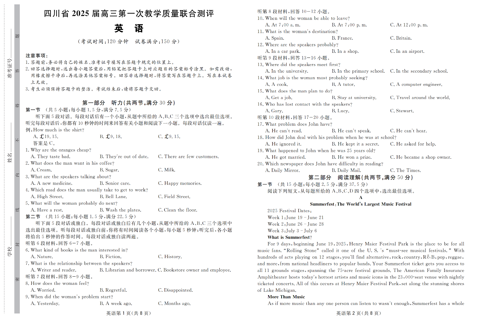 四川省2024-2025学年下学期2月高三第一次教学质量联合测评英语+答案