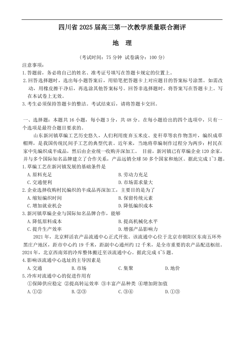 四川省2024-2025学年下学期2月高三第一次教学质量联合测评地理+答案