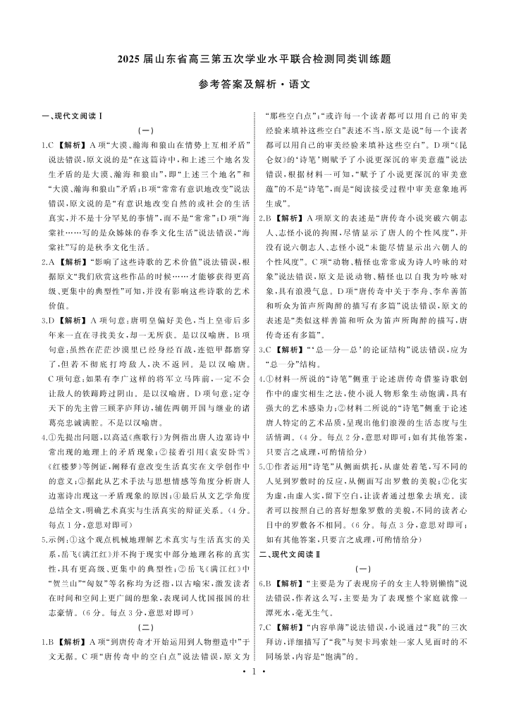 山东省齐鲁名校联考2024-2025学年下学期高三联合检测(五)语文答案